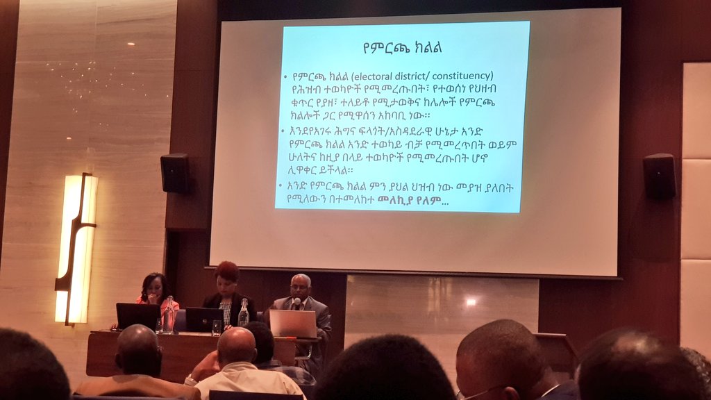 በስነ ስርዓቱ ላይ የህግ ምሁሩ ዶ/ር ጌታቸው አሰፋ “የምርጫ ክልሎች አከላለል መርሆዎች እና ህጋዊ ማዕቀፉን” የተመለከተ ገለጻ አቅርበዋል። የምርጫ ክልል “የሕዝብ ተወካዮች የሚመረጡበት፣ የተወሰነ የህዝብ ቁጥር የያዘ፣ ተለይቶ የሚታወቅ እና ከሌሎች የምርጫ ክልሎች ጋር የሚዋሰን አካባቢ” እንደሆነ ገልጸዋል። በአንድ የምርጫ ክልል እንደ የሀገሩ ሁኔታ አንድ አሊያም ሁለትና ከዚያ በላይ ተወካዮች ሊመረጡ እንደሚችሉም ጠቁመዋል።