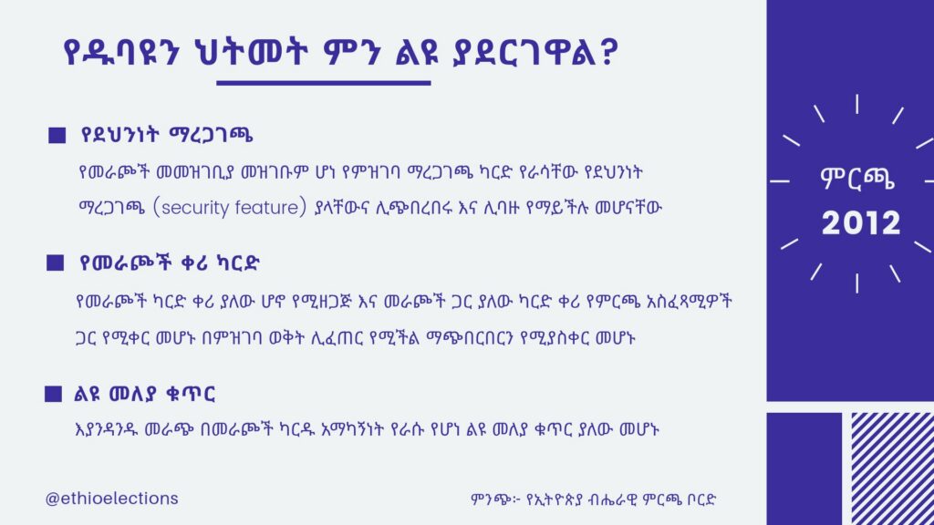 ምርጫ ቦርድ የዱባዩ ህትመት የመራጮች ምዝገባን ዘመናዊ እና ተዓማኒ እንደሚያደርግ ጠቁሟል። ህትመቱ የምርጫው ሂደት አለም አቀፍ ደረጃን የጠበቀ እና አዲሱ የምርጫ ህግ ላይ የተቀመጡትን መስፈርቶች ያሟላ እንዲሆን የሚያስችል ነውም ተብሏል። ከዚህ በተጨማሪም ሊፈጠሩ የሚችሉ ስህተቶችን ለመቀነስና እና ማጭበርበርን ለማስወገድ እንደሚረዳ ተገልጿል።